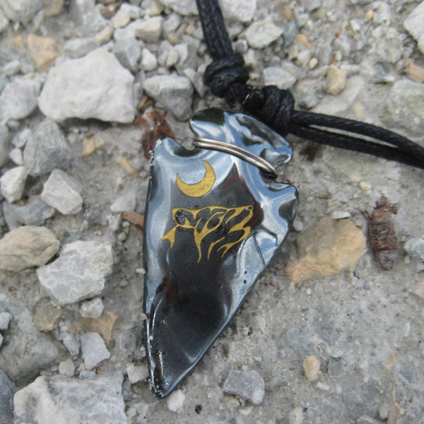 A glossy arrowhead pendant inlaid with a golden wolf image. Pendant comes on a cord neck. Color choice of rainbow or black pendants.