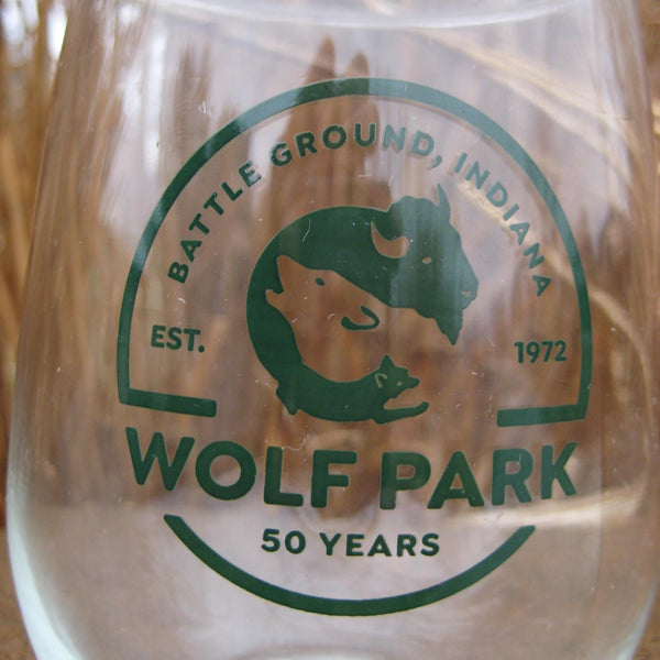 A 17oz stemless wine glass featuring Wolf Park's 50th Anniversary logo in forest green.