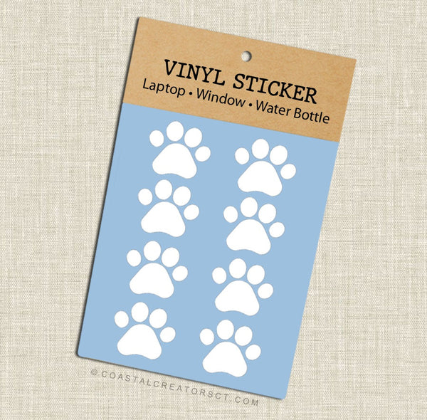 Sets of eight paw print stickers to make tracks across your favorite things. Great for laptops, windows, bottles, and more. (Note: these are STICKERS, not decals. They will not be easily removed.)