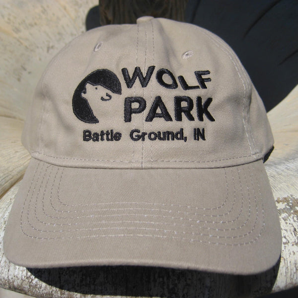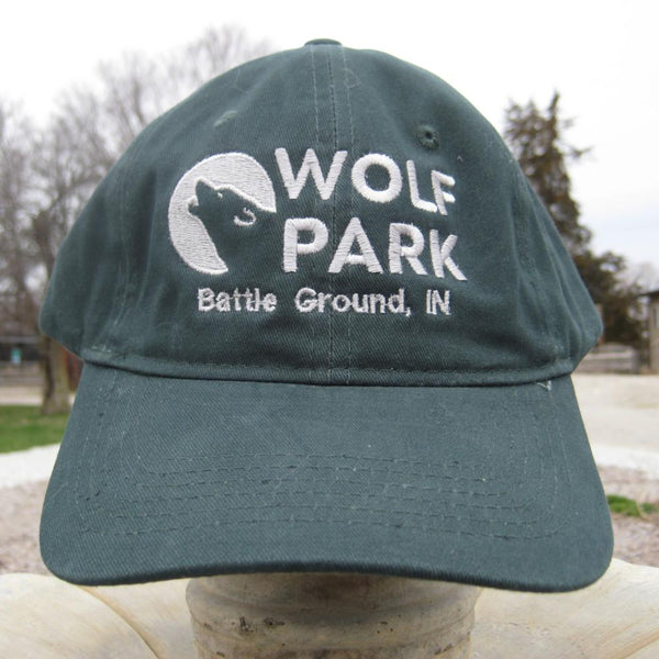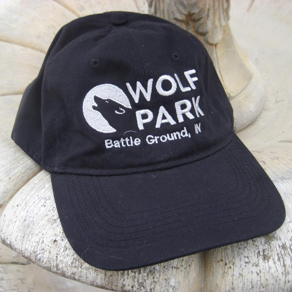 One-size-fits-all, 100% cotton baseball-style hats with silver paw print, "Wolf Park, Battle Ground, Indiana" embroidered on the front. Adjustable back strap.